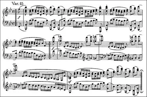 Following without a pause from the previous number, Variation 15, marked forte, is a bravura variation building relentlessly toward an exciting climax. It consists of a one-bar pattern, varied only slightly, of two declamatory chords in eighth notes in the higher registers, followed by lower sixteenth notes that echo Handel's original turns. A prominent upbeat creates syncopated energy. It has been called an étude for Brahms's Piano Concerto No. 2.[11] It breaks the structural mould of Handel's theme by adding one "extra" bar. In Brahms's first autograph, Variations 15 and 16 were positioned in the reverse order.[20]