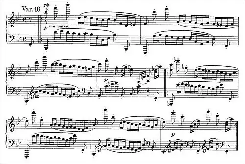 Variation 16 continues from Variation 15 as a "variation of variation",[21] repeating the pattern of two high eighth notes followed by a run of lower sixteenth notes. It also forms another pairing with Variation 17. Baroque contrapuntal techniques appear again in this canon, described by Malcolm MacDonald as "wittier" than the canon of Variation 6.[13] The left hand begins with two descending staccato eighth notes, immediately followed in the opposite hand by the two eighth notes inverted, a full four octaves higher. In each case, a figure in sixteenth notes follows in canonic imitation. The effect is light and exhilarating.