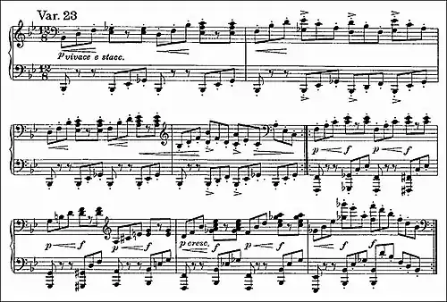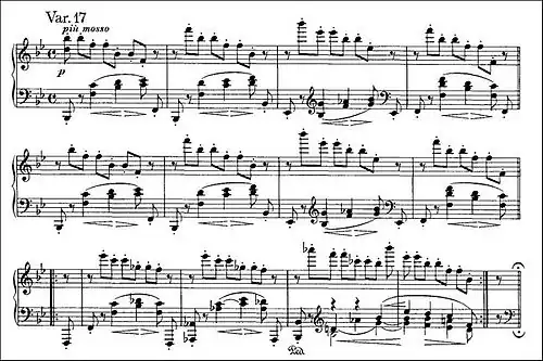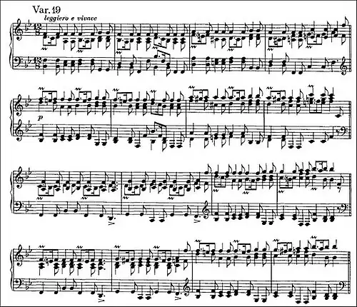 In Variation 17, the absence of the sixteenth notes that were so prominent in the preceding two variations gives the impression of a slowing, despite the marking of più mosso. The effect is of gently falling raindrops, with gracefully descending broken chords in the right hand, piano and staccato, repeated throughout the work at various pitches. Each note is played twice, adding to the suggestion of a leisurely pace.