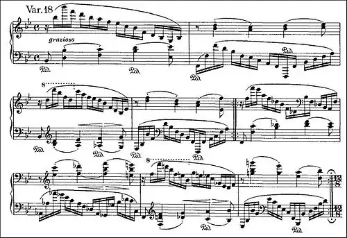 Another "variation of a variation", paired with the preceding Variation 17.[21] The accompaniment from the previous variation, which now echoes the melody of the aria, is now syncopated and alternating between the hands, while the "raindrops" are replaced by sweeping arpeggios.