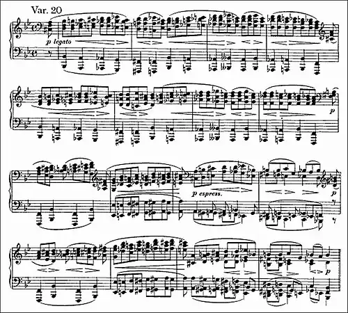 From the outset, Variation 20 builds toward its climax. In contrast to the preceding variation, there is little of the Baroque in it with its chromaticism in both treble and bass and its thick textures (triads in the right hand against octaves in the left hand). Malcolm MacDonald refers to its "organ-loft progressions".[13]