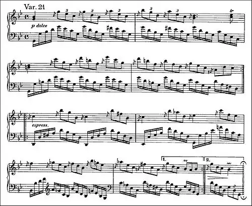 Variation 21 moves to the relative minor (G minor). Like Variation 19, the theme is hidden, in this case by merely gracing the main notes of the theme in passing, thereby achieving a sense of lightness. It is another example of Brahms' use of polyrhythms, this time pairing three notes against four.