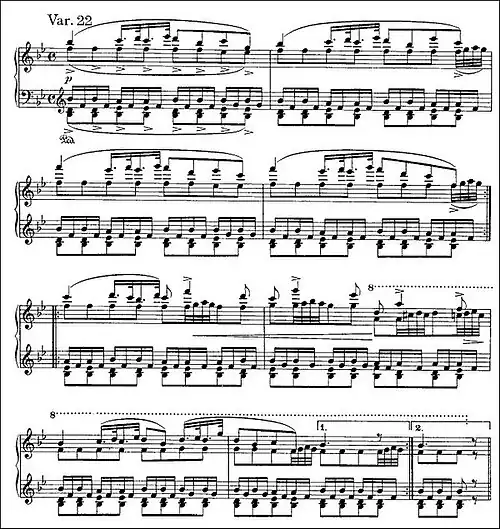 There are various opinions about the organization of the Handel Variations. Hans Meyer, for example, sees the divisions as nos. 1–8 ('strict'), 9–12 ('free'), 13 ('synthesis'), 14–17 ('strict') and 18–25 ('free'), culminating in the fugue.[15] William Horne emphasizes paired variations: nos. 3 and 4, 5 and 6, 7 and 8, 11 and 12, 13 and 14, 23 and 24. This helps him to group the set as 1–8, 9–18, 19–25, with each group ending with a fermata and preceded by one or more variation pairs.[16] John Rink, focusing on Brahms's dynamic markings, writes,