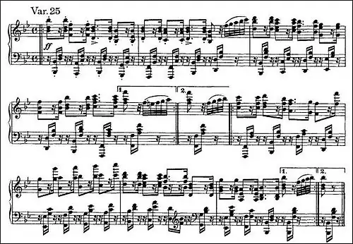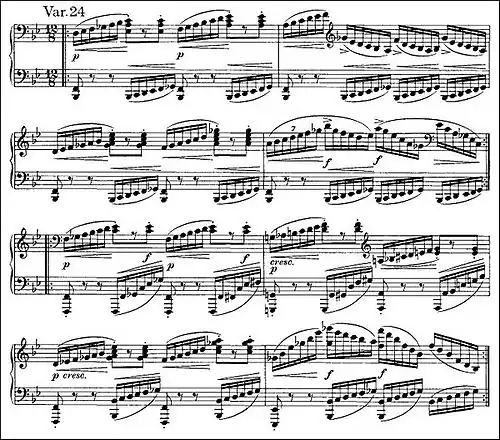 In preparation for the climactic final variation, Variation 24 intensifies the excitement, replacing the triplets of Variation 23 with masses of sixteenth notes. Clearly modeled on the preceding, it is another example of Brahms's use of "variation of variation".[21]