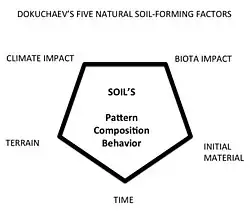 - Dokuchaev considers the soil as a natural body having its own genesis and its own history of development, a body with complex and multiform processes taking place within it. The soil is considered as different from bedrock. The latter becomes soil under the influence of a series of soil-formation factors (climate, vegetation, parent material, relief and age). According to him, soil should be called the "daily" or outward horizons of rocks regardless of the type; they are changed naturally by the common effect of water, air and various kinds of living and dead organisms.[1]