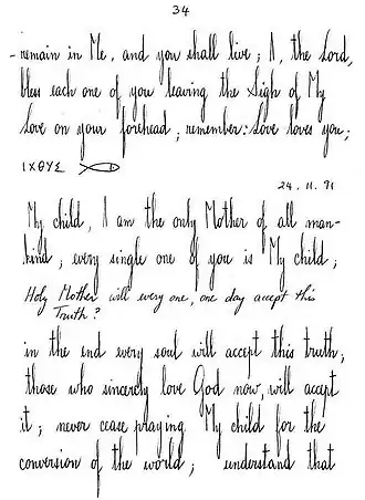 Rydén's first "handwritten" edition of True Life in God were produced in 1990 by Catholic publisher Editions O.E.I.L. of Paris, with a foreword written by Fannan. In 1991, the organization called Trinitas was formed to typeset Rydén's writings and publish them in many languages.[29] In September 1991, Mariologist Father Philip Pavich was given a copy of Rydén's original messages complete with deletions and modifications showing how Rydén and an editorial assistant had modified the messages for publication. Pavich circulated a critical comparison showing the changes made from the original notebooks to the handwritten edition of True Life in God. Associates of Rydén questioned her; she responded by saying that the deleted text was "taken out with God's guidance."[15] She explained that she keeps two notebooks: a private one filled with original messages, and a public one containing material rewritten from the private notebook. Dermine wrote in 2008 that the deleted material includes failed prophecies, and disappointments in Rydén's life, such as the Virgin Mary telling Rydén in June 1988 that she would arrange a meeting between Rydén and Marian Movement of Priests founder Stefano Gobbi—a meeting that never happened.[15]