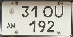 Vehicle registration plates of Armenia have black characters on a rectangular white background. They are composed of two or three numbers, two letters (smaller than the digits) in the middle, and two (or three) other numbers. At the left side is located the international code "AM" with an oval car plaque and, sometimes, the national flag. Starting from 6 August 2014 a new design of license plates was implemented.[1] The license plates have a national flag on the left side, a security hologram and a machinery readable Data Matrix Code.