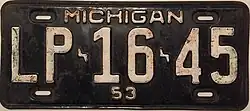 | 1953 | White on black, "MICHIGAN" at top and "53" at bottom | none | AB-12-34 | County-coded | ||