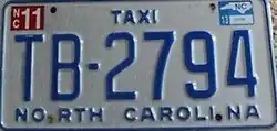 Taxi | 2006–present | Embossed blue on white with border line; "NORTH CAROLINA" at bottom; "TAXI" at top | TB-1234 | TA-1001 to present | Issued annually through 2005.[9] Issuing TC series as of August 19, 2019. |