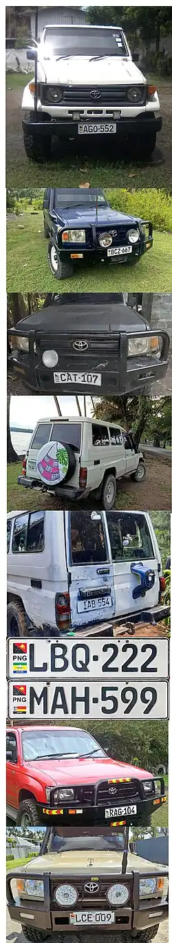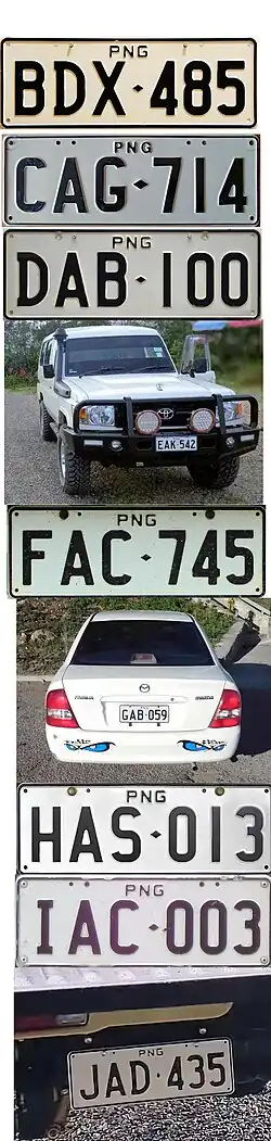 Papua New Guinea] (Papua Niugini in Tok Pisin) requires its residents to register their motor vehicles and display vehicle registration plates.[1] Motor vehicle registration is the responsibility of Motor Vehicle Insurance Limited (MVIL). Current plates are in two styles; Australian standard 372 mm × 134 mm, and use Australian stamping dies, and what is commonly referred to as "Euro Flag" style. The latter has the flag of Papua New Guinea and often a provincial flag from Morobe or Madang Province on the left. The stamping dies are German FE style.[2] Commencing in April 2025, flag style plates were no longer offered, reverting back to the standard Australian style. This commenced at LCG-000. Since the mid 1990s, plates have been issued with the first letter identifying the province of issue. As of 2025, most private and commercial motor vehicles use standard white plates with black lettering. Special number plates are issued to Consular staff, Diplomatic staff, Government owned vehicles, motorcycles, public motor vehicles (buses), taxis, trailers and to those engaged in selling or repairing vehicles. Especially in the provincial areas, many vehicles feature either just one plate, or a home-made alternative to replace a missing officially issued plate.