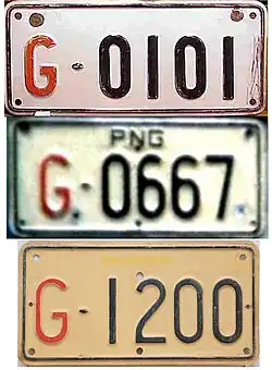| Registration plate used motorcycles belonging to the National Government of Papua New Guinea. Introduced in 1975 to reflect independence from Australia. | ![]() |