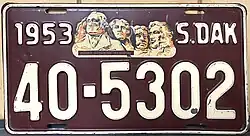 1953 | Embossed beige on maroon with border line; "1953", Mount Rushmore decal and "S.DAK" at top | none | 1-1234 1-A123 10-1234 10-A123 |