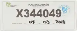 2017 | Black characters on white stripe in center and dark green stripe at top and light green stripe at bottom | "Exonerada Estatal Automovil" (Exempt State Automobile) | AB 01234 |