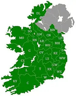 The city codes are a single letter, the initial letter of its English-language name. Most county codes use the first and last letters of the county's name. For example, Sligo is SO. The exceptions to this are: