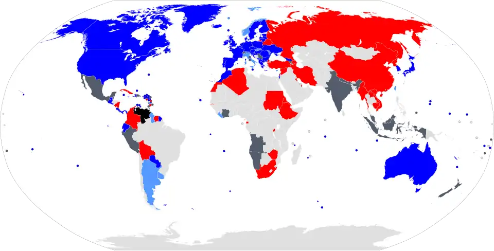 At his peak, Guaidó was recognized as legitimate by about 60 countries, despite never running as president; Maduro by about 20 countries.[9][10][11] However, Guaidó's international support waned over time.[12] Internationally, support followed geopolitical lines, with Russia, China, Cuba, Iran, Syria, and Turkey supporting Maduro, while the majority of Western and Latin American countries supported Guaidó as acting president.[9][13][14] Support for Guaidó began to decline when a military uprising attempt in April 2019 failed to materialize.[15][16] Following the failed uprising, representatives of Guaidó and Maduro began mediation, with the assistance of the Norwegian Centre for Conflict Resolution.[17] After the second meeting in Norway, no deal was reached.[18] In July 2019, negotiations started again in Barbados with representatives from both sides.[19][20][21] In September, Guaidó announced the end of dialogue following a forty-day absence by the Maduro government as a protest against the recent sanctions by the United States. In March 2020, the United States proposed a transitional government that would exclude both Maduro and Guaidó from the presidency.[22] U.S. Secretary of State Mike Pompeo said that sanctions did not apply to humanitarian aid during the coronavirus pandemic health emergency and that the United States would lift all sanctions if Maduro agreed to organize elections that did not include himself.[23] Guaidó accepted the proposal,[24] while Venezuela's foreign minister, Jorge Arreaza, rejected it.[25]
