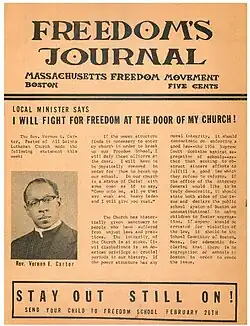 Flyer advertising Carter's "Freedom Vigil" in 1965. Freedom's Journal was the name of the first African-American newspaper in the United States, published between 1827 and 1829.