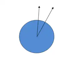 For a spinning earth, the plumb line deviates from the radial direction as a function of latitude.[7] Only on the equator and at the North and South Poles does the plumb line align with the local radius. The situation is actually even more complicated because Earth is not a homogeneous smooth sphere. It is a non homogeneous, non spherical, knobby planet in motion, and the vertical not only need not lie along a radial, it may even be curved and be varying with time. On a smaller scale, a mountain to one side may deflect the plumb bob away from the true zenith.[8]