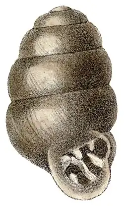 The shell is small, subcylindrical, smooth shining. Growth lines are very fine, a little oblique. Apex is smooth. The color of the shell is dark chest-nut. The shell has 5 rounded whorls, that are somewhat regularly increasing and decreasing to a bluntly rounded apex. Sutures are impressed.[2]