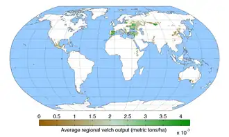 In 2017, global production of vetches was 920,537 tonnes.[15] That year, 560,077 acres were devoted to the cultivation of vetches in the world. Over 54% of that output came from Europe alone. Africa (17.8% of world total), Asia (15.6% of world total), Americas (10.6% of world total) and Oceania (1.8% of world total).[14]