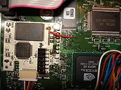 The motherboard of an original Xbox, with a Xenium ICE modchip installed
