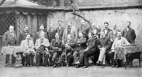 The tournament celebrated the fiftieth anniversary of Emperor Franz Joseph I of Austria's accession to the throne of Austria-Hungary.[1] Main organiser was Baron Albert Freiherr von Rothschild who also financed the Vienna tournaments of 1873, 1882, 1903,[2] and 1908. The players visited his Heugasse palace on 31 May 1898. Rounds were played in the clubhouse of the Wiener Schachklub at Schottengasse 7. Hugo Fahndrich was the tournament director at Kaiser Jubiläumsturnier 1898.[3] The time limit was thirty moves in two hours, and fifteen moves per hour after this.[4] Twenty great masters (only Emanuel Lasker and Rudolf Charousek were absent at Kaiser-Jubiläumsturnier) played double rounds from 1 June to 25 July.