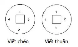 The inscriptions of Vietnamese cash coins can be written in either the Viết chéo (曰湥 / 曰袑, top-bottom-right-left) style or the Viết thuận (曰順, clockwise, top-right-bottom-left) style.[10]