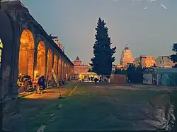 The site was conceived as a large cloister for the Oratorian order. The nearly circumvalent arcade was built between 1755-1757 under the patronage of Don Angelo Serio, who left his inheritance to the order. His portrait is sculpted on the inner side of the entrance arch. Some of the walls inside the arcade were frescoed by Vito D’Anna and Antonio Manno. In the center is a Billiemi stone fountain (1759) sculpted by Gioacchino Vitagliano, and decorated with statues of the saints Ignatius of Loyola, Felix of Cantalice, Camillo de Lellis, and Carlo Borromeo. At the start or the 20th-century, the courtyard contained a movie theater and an arena. There are presently performances in the space, with a planetarium and astronomy museum now occupying the old cinema.[1]