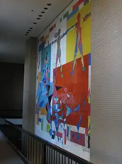 • Enlightenment and Joy, porcelain enamel mural (1977) entrance to Wesley W. Posvar Hall University of Pittsburgh.[20] The vibrant colors are the result of several layers of paint on each individual tile.[17]