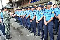 Philippine authorities mobilized about 37,500 police and military personnel in Manila, Tacloban, and Palo during the visit: 7,000 from the Armed Forces plus 5,000 reservists, 25,000 police officers, and a 450-man security force recently returned from United Nations peacekeeping missions in the Golan Heights and Liberia. Snipers were also deployed in buildings along Roxas Boulevard in Manila.[3]