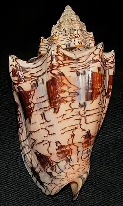 Voluta ebraea, commonly known as the Hebrew volute, is a species of medium-sized carnivorous sea snail, a marine gastropod mollusk in the family Volutidae, the volutes.[6] It is endemic to the northern and northeastern coasts of Brazil, and inhabits the littoral zone in a variety of substrates, including sandy bottoms, coral reefs, and rocky areas from shallow waters to depths of up to 70 meters. It is known for its robust, cream-colored shell marked with reddish-brown patterns said to resemble Hebrew script.