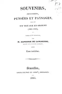 Impressions, souvenirs, pensées et paysages pendant un voyage en Orient, 1832-1833, ou Notes d'un voyageur was first published in 1835 by Charles Gosselin in Paris. Lamartine's travel account was very popular during the mid-nineteenth and twentieth century. The book was translated in many European languages (e.g. English, German, Dutch, and Italian) and re-edited sixteen times during Lamartine's lifetime.[12]