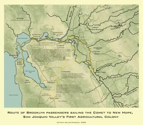 The Brooklyn arrived at the San Francisco Bay shortly after the Mexican–American War commenced in California, just as U.S. forces were gaining control of the area.[14] Brooklyn's seventy male passengers were immediately pressed into service. Building the settlement had to wait while assigned military duties were performed.[15][16] With food and shelter scarce,[17] the colonists experienced initial hardships. Nonetheless, within three months, many acres of land in the San Joaquin Valley were fenced, planted with wheat, and a grain mill was erected.[18] When military conflict moved south, the passengers worked communally to construct one hundred buildings during the first year. Soon eight nearby towns were founded, connected by ferries, roads and bridges.[19][20] As other American settlers arrived, San Francisco grew into "the great emporium of the Pacific"[21] and farm produce yielded one of California's first millionaires, John Horner.[22]