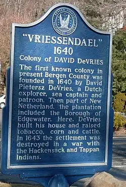 Vriessendael was a patroonship on the west bank of the Hudson River in New Netherland, the seventeenth century North American colonial province of the Dutch Empire. The homestead or plantation was located on a tract of about 500 acres (2.0 km2) about an hour's walk north of Communipaw[1] at today's Edgewater. It has also been known as Tappan, which referred to the wider region of the New Jersey Palisades, rising above the river on both sides of the New York/New Jersey state line, and to the indigenous people who lived there and were part of wider group known as Lenape (later called Delaware Indian). It was established in 1640 by David Pietersen de Vries (c. 1593-c.1655), a Dutch sea captain, explorer, and trader who had also established settlements at the Zwaanendael Colony[2] and on Staten Island. The name can roughly be translated as De Vries' Valley. De Vries also owned flatlands along the Hackensack River, in the area named by the Dutch settlers Achter Col.[3] Parts of Vriessendael were destroyed in 1643 in reprisal for the slaughter of Tappan and Wecquaesgeek Native Americans who had taken refuge at Pavonia and Corlears Hook. The patroon's relatively good relations with the Lenape prevented the murder of the plantation's residents, who were able to seek sanctuary in the main house, and later flee to New Amsterdam. The incident was one of the first of many to take place during Kieft's War, a series of often bloody conflicts with bands of Lenape, who had united in face of attacks[4] ordered by the Director of New Netherland.[5]