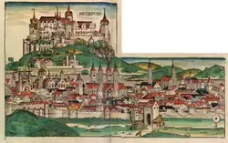 A Bronze Age (Urnfield culture) refuge castle, the Celtic Segodunum,[6] and later a Roman fort, stood on the hill known as the Leistenberg,[7] the site of the present Fortress Marienberg. The former Celtic territory was settled by Alamanni in the 4th or 5th century later by the Franks in the 6th to 7th. Würzburg was the seat of a Merovingian duke from about 650. It was Christianized in 686 by Irish missionaries Kilian, Kolonat and Totnan. The city is mentioned in a donation by Duke Hedan II to bishop Willibrord, dated 1 May 704, in castellum Virteburch. The Ravenna Cosmography lists the city as Uburzis at about the same time.[8] The name is presumably of Celtic origin, but based on a folk etymological connection to the German word Würze "herb, spice", the name was Latinized as Herbipolis in the medieval period.[9][10]