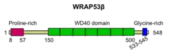 The WRAP53β protein is highly evolutionary conserved, with homologs (confined to its WD40 repeats) in vertebrates, invertebrates, plants and yeast.[5][12][13] WRAP53β consists of a proline-rich N-terminus, a central WD40 domain and a glycine-rich C-terminus (Figure 3). The WD40 domain of WRAP53β serves as a scaffold for multiple interactions between a wide variety of molecules.