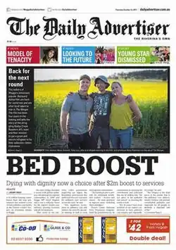 The Daily Advertiser is the regional newspaper which services Wagga Wagga, New South Wales Australia and much of the surrounding region. It is published Monday to Friday but also appears as a sister publication called The Weekend Advertiser on Saturdays. The paper reaches about 31,000 people during its Monday to Friday printing, equating to 85% of all people aged over 14 who live in the paper's main coverage area.[1]