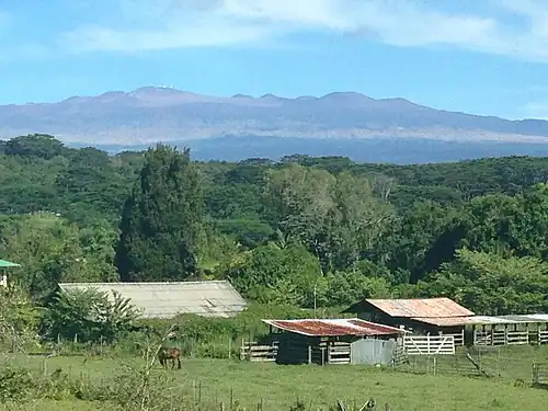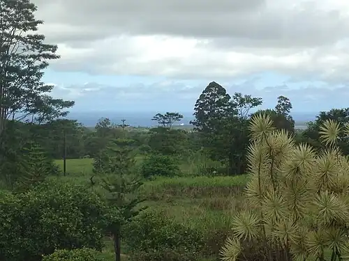 As Waiakea-Uka is on the lower flanks of Mauna Loa, the area is known in for its rainfall; in August 2013, the Waiakea-Uka NWS rain gauge showed 83.96 inches of accumulated rain, while the Hilo International Airport rain gauge only registered 57.97 inches for the same length of time; though these two rain gauges are about 6 miles apart, this represents a difference of 25.99 inches, or about the average yearly rainfall of the state of Kansas.[5] As a result, Papaya, Guava, Citrus and Plumeria are grown by many residents. In recent years, plums and peaches can be seen around many of the area's fields.
