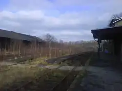 Waldheim station was opened in 1852 when the line between Limmritz and Chemnitz, the last section of the Riesa–Chemnitz railway, was opened. Despite the fact that two branch lines — the Waldheim–Rochlitz railway and the Waldheim–Kriebethal railway which was opened 1896 - joined the mainline here, the track plan of this junction station remained comparatively simple. In the last years of the line there was only one track with a run-around loop for the locomotives of the Rochlitz trains. They used the island platform which at this time had remained the only platform in the station (a second platform without a canopy had been removed when the mainline was re-doubled and electrified). The opposite side of the island platform was and still is used by the mainline trains between Riesa and Chemnitz. With the building work progressing, the Rochlitz track was joined to the mainline, too, but is hardly used any more. The station building had stood empty and suffered from increasing decay for several years until most of it was demolished in 2015, leaving only the porticus.[22][23] The long goods shed and the engine shed that was accessible via a turntable are also abandoned and decaying. The engine shed used to house locomotives for shunting duties and for the freight services to the paper mills in the Zschopau valley. Some team tracks have remained in use for a few years after closure of the WR line,[24][18] but now (2016) only a passing loop and two crossovers between the mainline tracks are left beside the latter.[25]
