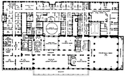 On the first floor, at the head-of the east main staircase, was the Astor Gallery, 87 by 102 feet (27 m × 31 m), looking out on 34th Street. The gallery, with seven French windows reaching 26 feet (7.9 m) from floor to ceiling, opened onto a terrace over the entrance to the hotel. The interior was finished in the style of the Hôtel de Soubise, with a blue, gray and gold color scheme. There was a parquet floor, and on the south side, opposite the street windows, were other windows which opened into the main corridor on the second floor. The musicians' balcony, upheld by two caryatids, was at the east end. All the balcony railings were of gilded metal work. The mural paintings were notable: four panels, two at either end of the room, and twelve pendentive panels, six on either side and painted by Edward Simmons depicted the four seasons and the twelve months of the year.[66] The "Colonial Room" was decorated in red, contrasting with white woodwork.[34] The second floor contained a private suite of apartments at the northeast corner, with large drawing rooms, dining room, butler's pantry, hallway, three bedrooms, three maids' bedrooms and five bathrooms, all finished in old English oak. All the floors above the third were given up to suites and bedrooms up to the 14th floor. There was a bath for nearly every room, and every bathroom had windows opening to the air, not into shafts. In every room, there was a large trunk closet.[80]