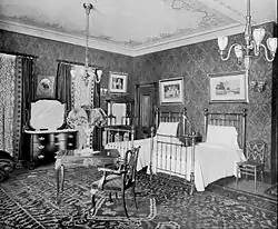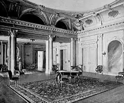 The Waldorf State Apartments, consisting of nine suites, were located on the second floor. The apartments, including the Henry IV Drawing Room, featured 16th and 17th century French and Italian antiques which Boldt and his wife had brought back from Europe.[71] Francois V Bedroom was a reproduction of the room at the Palais de Fontainebleau, and over the years was occupied by the likes of Li Hung-Chang of China, Chowfa Maha Rajiravuth, Prince of Siam, and Albert of Saxe-Coburg.[72] The apartments had their own music room and a banquet hall to seat 20, with a handsome china collection including 48 Sevres plates with European portraits.[73] There were about 6,000 lights in the hotel, with as many as 1,000 small candelabra lamps mounted in specially designed fixtures.[74] The electric fixtures were all furnished by the Archer & Pancoast Manufacturing Company, of New York, while the contract for the general installation work was carried out by the Edison Electric Illuminating Company, of New York, the actual work of wiring being done by the Eastern District of the General Electric Company. The building was wired throughout on the system of the Interior Conduit and Insulation Company.[74]