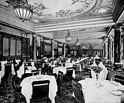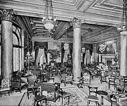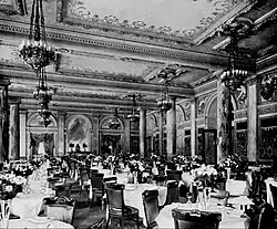 The ballroom, in the Louis XIV style, has been described as the "pièce de résistance" of the hotel, measuring 65 feet (20 m) by 95 feet (29 m) and 40 feet (12 m) (three stories) in height.[58] It had a capacity to seat 700 at banquets and 1,200 at concerts, and featured tints of ivory-gray and cream in its design.[34] Noted vocalists such as Enrico Caruso and Nellie Melba performed in the ballroom, with conductor Anton Seidl leading a series of concerts there in the year the combined hotels opened for business. It was possible to buy season tickets for the musical offerings; a box for a season was US$350 and a seat for a season on the ballroom floor was priced at US$60.[81]