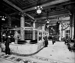The exterior featured loggias, balconies, gables, groups of chimneys, and tiled roofs.[66] One of the chief features was the interior garden court, with fountains and flowers, walls of white terracotta, frescoes and stained glass. The main entrance to the hotel was "sheltered by an elaborate frosted-glass-and-wrought-iron marquee", and the entrance hall was built in Sienna marble, with a mosaic title floor and a coffered ceiling.[64] The original reception desk of the Waldorf Hotel became a registration desk when it merged with the Astoria Hotel in 1897.[64]