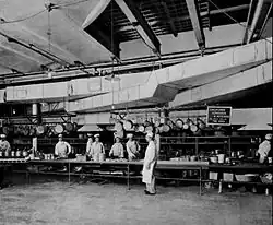 In the sub-basement were the Sprague screw machines for the electric elevators, the fire pumps, the house pumps, the ice plant, and the six Babcock & Wilcox water tube boilers. The elevator system, which served the house from subbasement to roof, was electric, taking its power from the generating plant within the building. There were 18 elevators.[66] The machinery was located in the sub-basement. The boilers aggregated about 3,000 horse power, the electric generators taking 2,200 horse-power of the total energy. The elevators were run by it, as were the 15,000 incandescent lamps, branching from 7,500 outlets.[34] The system of heating and ventilating the public rooms was that of forced draught by means of powerful blowers situated in the sub-basement that forced the fresh air between steam-coils, where it became moderately heated before entering the ducts that lead it to the various rooms. This heat was further augmented by direct radiators placed behind screens in the recesses of the windows and elsewhere.[34]