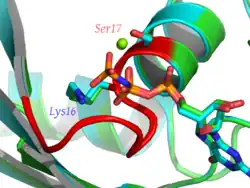 Walker A motif, also known as the Walker loop, or P-loop, or phosphate-binding loop, is a motif in proteins that is associated with phosphate binding. The motif has the pattern G-x(4)-GK-[TS], where G, K, T and S denote glycine, lysine, threonine and serine residues respectively, and x denotes any amino acid. It is present in many ATP or GTP utilizing proteins; it is the β phosphate of the nucleotide that is bound. The lysine (K) residue in the Walker A motif, together with the main chain NH atoms, are crucial for nucleotide-binding.[6] It is a glycine-rich loop preceded by a beta strand and followed by an alpha helix; these features are typically part of an α/β domain with four strands sandwiched between two helices on each side. The phosphate groups of the nucleotide are also coordinated to a divalent cation such as a magnesium, calcium, or manganese(II) ion.[7]