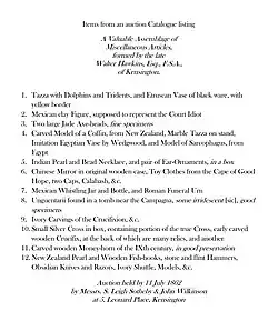 Hawkins left his large collection of coins and medals to the United Services Institute in London. It is now the Royal United Services Institute for Defence & Security Studies (RUSI) in Whitehall. The RUSI Museum was housed in the Banqueting House, Whitehall but the collection was broken up when the government of the day regained full use of the Hall in the early 1960s.[23] There seems to be no record of where items from the collection went. The lease on Hawkins's house, together with several items of furniture and “20 doz. of choice Madeira and other wines”, were auctioned in May 1862.[24] About two months later, on 11 July 1862, Messrs. S. Leigh Sotheby & John Wilkinson auctioned “a valuable assemblage of miscellaneous articles of ancient, mediaeval and modern art, formed by the late Walter Hawkins, Esq., F.S.A. of Kensington.” The front page of the auction catalogue gives a good indication of the range of objects he had amassed, perhaps as a result of his ship broking activities.