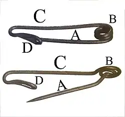 Hunt came up with the safety pin ("C") in 1849 through experimentation with high tension wire.[3][20][52] His invention was an improvement on the current way clothing items were attached together before because of a protective clasp ("D") at the end and a coiled wire design ("B") with a spring tension on the pointed end leg ("A") to keep it in the protective clasp even if the pin device was moved around. The basic design is the same in the twentieth century as when Hunt came up with the device in the nineteenth century and is manufactured inexpensively now.[53] W R Grace and Company made millions of dollars profit off the product.[54]