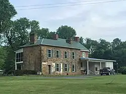 In 1861, a stone addition to the original 1774 Georgian structure was built. The large stone blocks used for the construction of the addition were quarried from the plantation's Mill Creek Mountain, a ridge located across the South Branch Potomac River to the west of the mansion. The stone blocks were hewed by sawyers, then transported across the river to the mansion, and lifted upon the addition's scaffolding with wheelbarrows. A Mr. Ferrybe supervised and managed the stone addition's construction.[35]