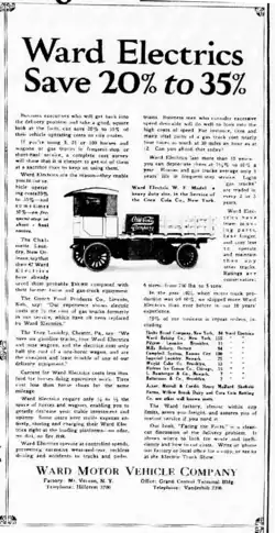 The Ward Electric car was a four-passenger coupe costing $2,100 and went 100 miles per charge.[2] In 1916, the price was $875.[3] The battery was an Edison battery.[3] In 1916, the price was dropped to $1,295.[4] The company stopped electric car production after 1916. In the year 1928, the model program consisted of types B, C, E, G, J, and M. The model B was offered for 1770 dollars. The model C for 1960 dollars, the model E for 2440 dollars, the model G for 2920 dollars, the model J for 3980 dollars, and the model M for 4890 dollars[5].It continued to make trucks until 1937.[1]