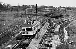 The Cleveland Interurban Railroad (CIRR), the predecessor of the Green Line, was extended 2⁄5 mile (0.64 km) from Courtland station to Warrensville Road in 1928 using track removed from the Coventry Road connection between Shaker Boulevard and Fairmount Boulevard.[5]: 45 University School had moved to its nearby 36-acre (15-hectare) campus two years earlier,[6] and CIRR had made a promise to school officials to extend the line.[5]: 45 The extension, which was originally a single track, was double-tracked in 1930. A turnaround loop was built just east of the Warrensville Center Road overpass.