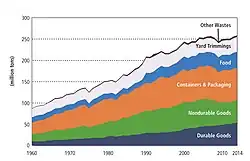 As a nation, Americans generate more waste than any other nation in the world, officially with 4.4 pounds (2.0 kg) of municipal solid waste (MSW) per person per day,[1] with another study estimating 7.1 pounds (3.2 kg) per capita per day.[2] Fifty five percent of this waste is contributed as residential garbage, while the remaining forty five percent of waste in the U.S.'s 'waste stream' comes from manufacturing, retailing, and commercial trade in the U.S. economy.[3] According to the American Society of Civil Engineers, Nevada produces the most waste at "[nearly] 8 pounds (3.6 kg) per person per day".[4] Approximately 90% of all waste produced by Nevadans ends up in landfills. "Wasteful" states Michigan, New Mexico, Wisconsin and Oregon as well as Washington also dominated the list's 5-year period.[5]